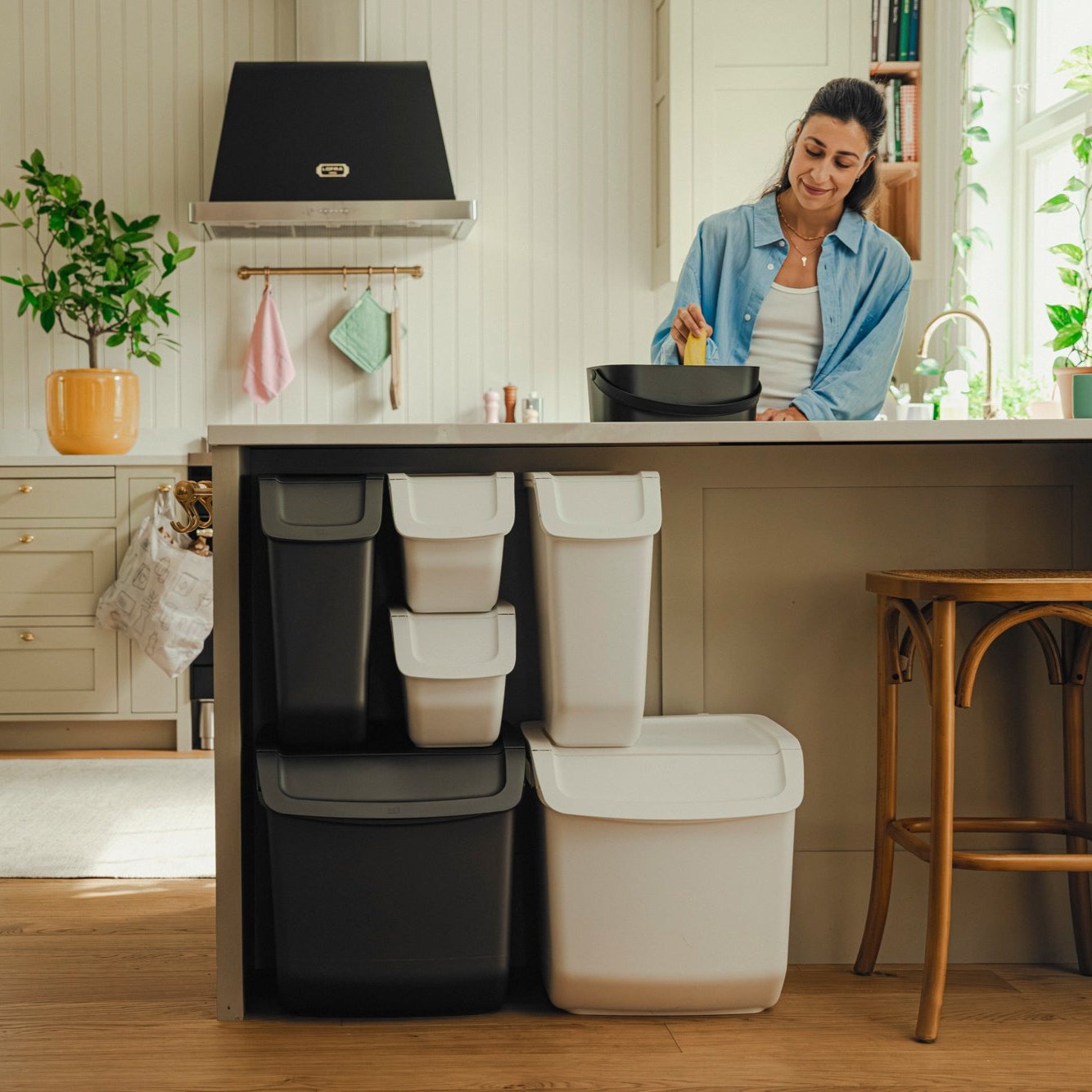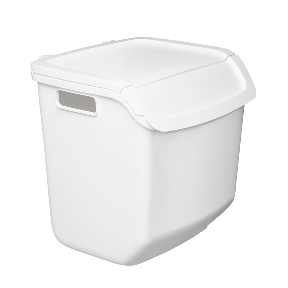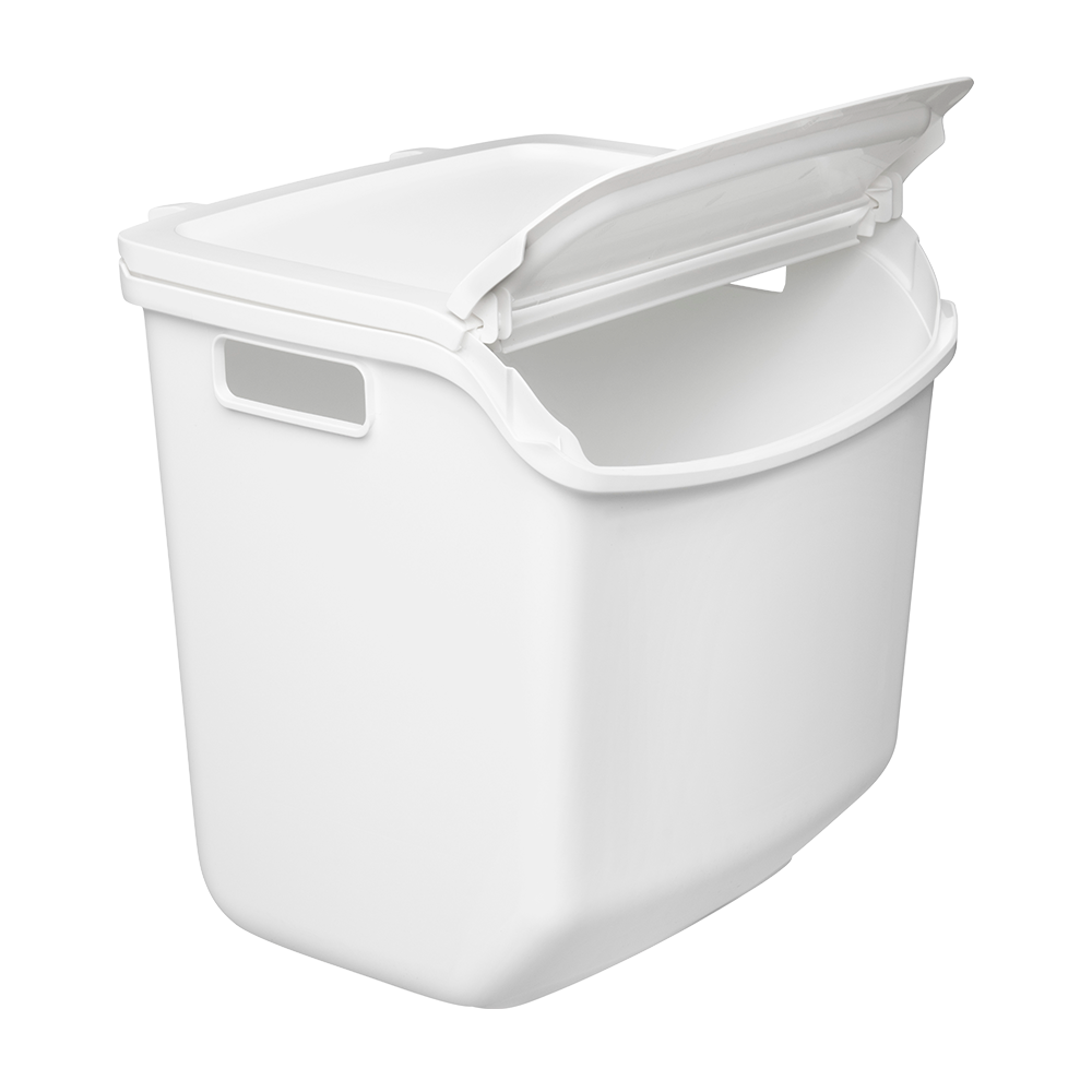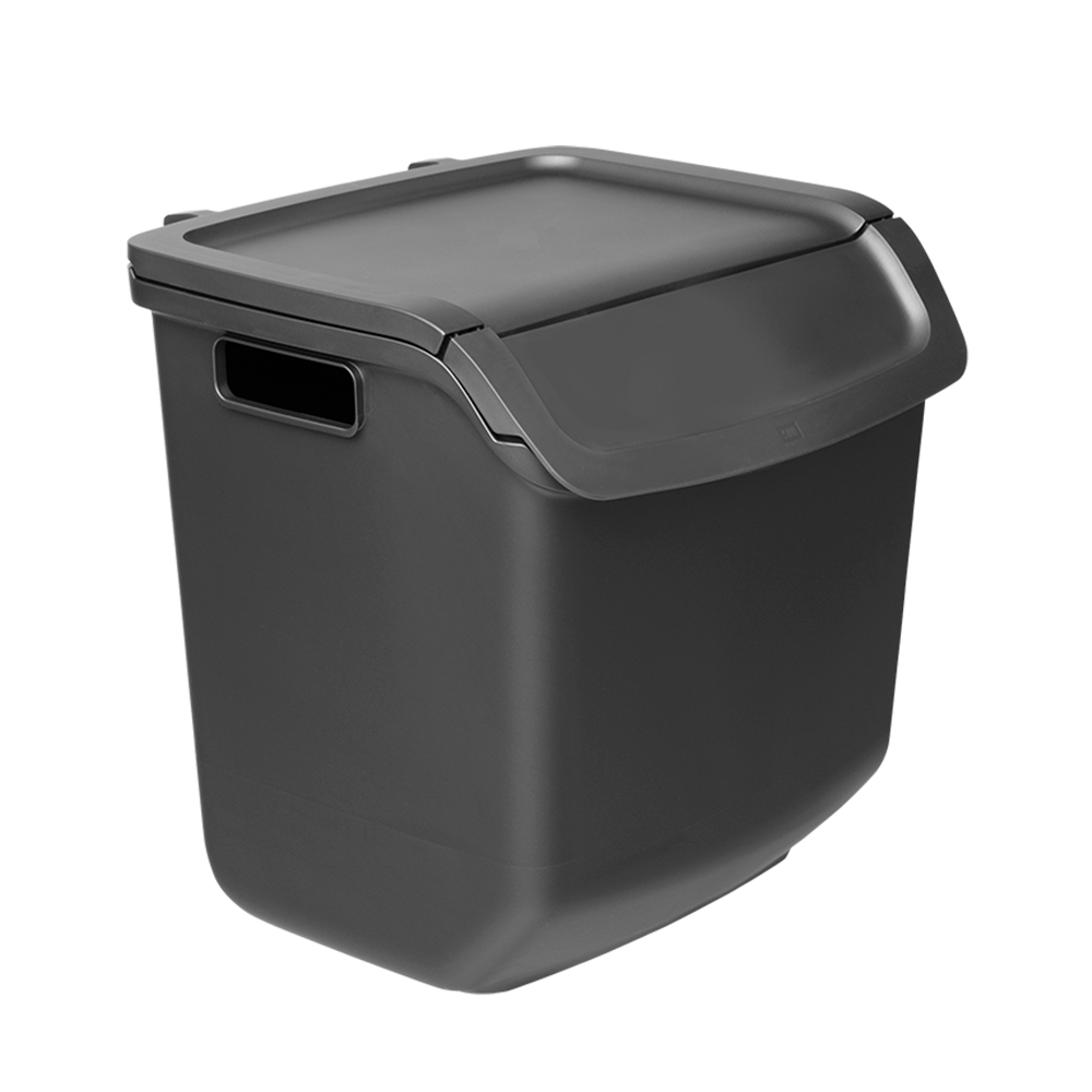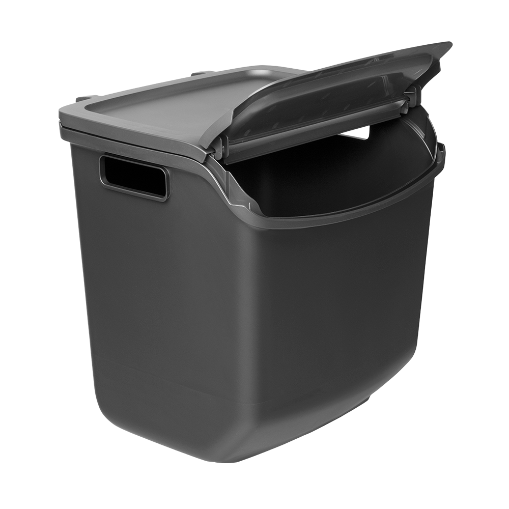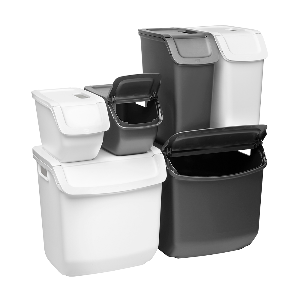 Kokoa tarpeen ja tilan mukaan – kaksi päällekkäin, monta rinnakkain. Kierrätysastia toimii yksin, mutta astioista on kätevä koota myös yhdistelmä useille jätelajeille vierekkäin ja/tai pinottuna. Kaksi kierrätysastiaa mahtuu päällekkäin useimpien keittiötasojen alle. Alimmaisen astian luukun saa auki, kun päällä on toinen astia. Astiassa on roskapussille pidikkeet. Astian kansi pysyy auki, jolloin astiaa on helppo täyttää, kantaa ja tyhjentää.
