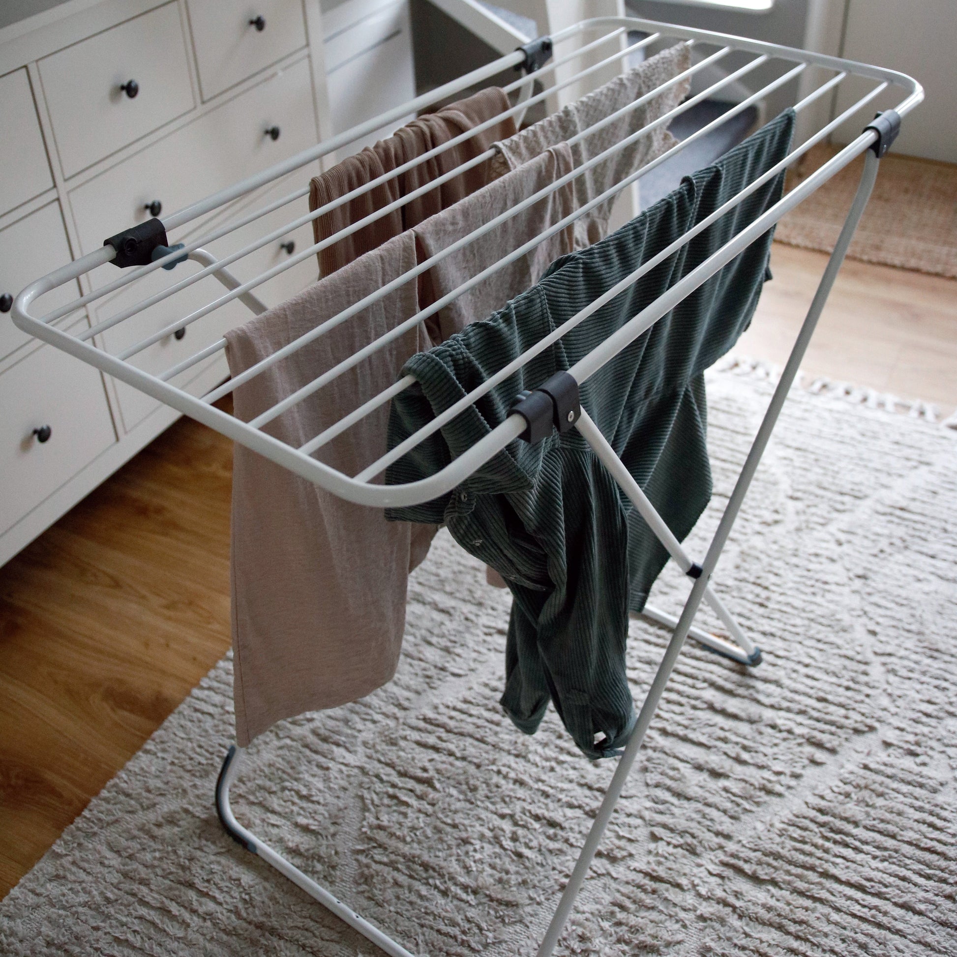 Jykevä teline ja mahtuu paljon vaatteita kuivumaan. Tyytyväinen tuotteeseen.