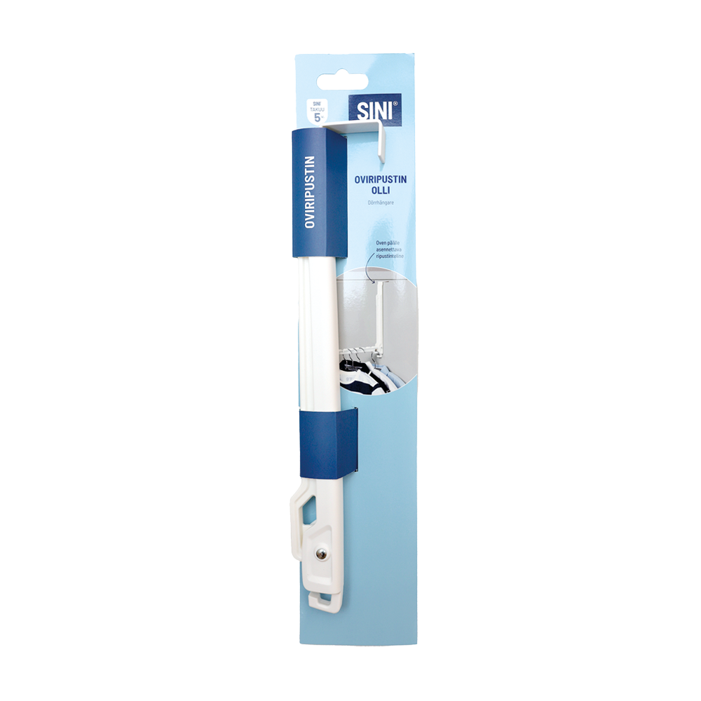 SINI Olli -oviripustin on näppärä, oven päälle asennettava ripustinteline, johon voi ripustaa kahdeksan henkaria ja pyyhkeen tai kylpytakin. Oviripustin on helppo avata ja sulkea ja sitä voidaan käyttää molemmissa asennoissa. Helppo siirtää paikasta toiseen. Täydellinen ripustin ahtaisiin tiloihin. Oviripustin kestää 5 kg verran painoa ja paikka 8 henkarille. Tuotteella on viiden vuoden SINI-takuu.