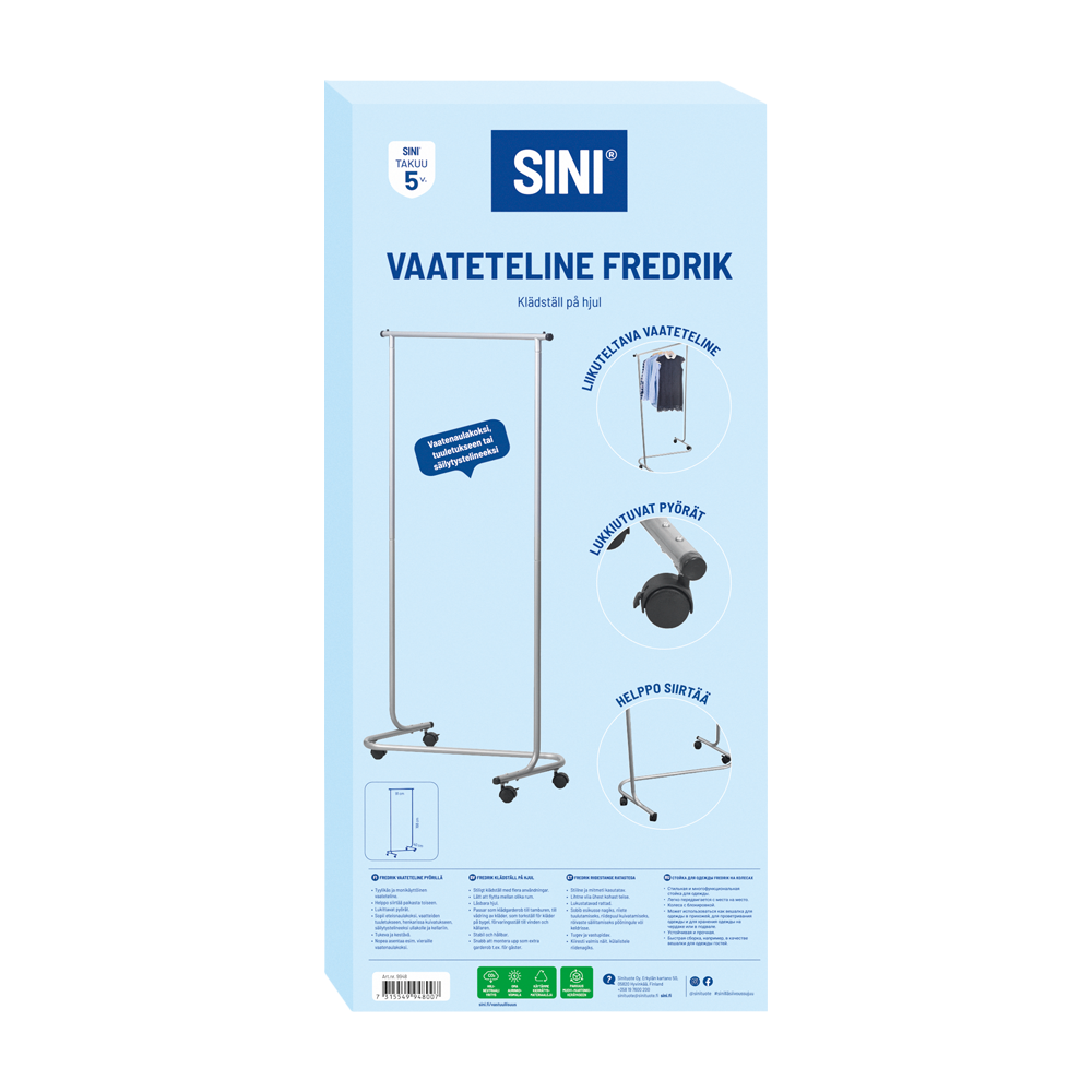 Monikäyttöisessä Fredrik-vaatetelineessä on tukevat lukittavat pyörät. Tuo lisätilaa vaatteiden säilytykseen ja tuuletukseen. Vaaterekki on helppo siirtää esimerkiksi parvekkeelle vaatteiden tuuletusta varten.